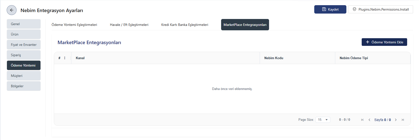 Bu tanımı yapmak için Yapılandırma > Nebim Ayarları > Ödeme Yöntemi > MarketPlace Entegrasyonları alanına gidiniz ve Ödeme Yöntemi Ekle butonuna tıklayınız.