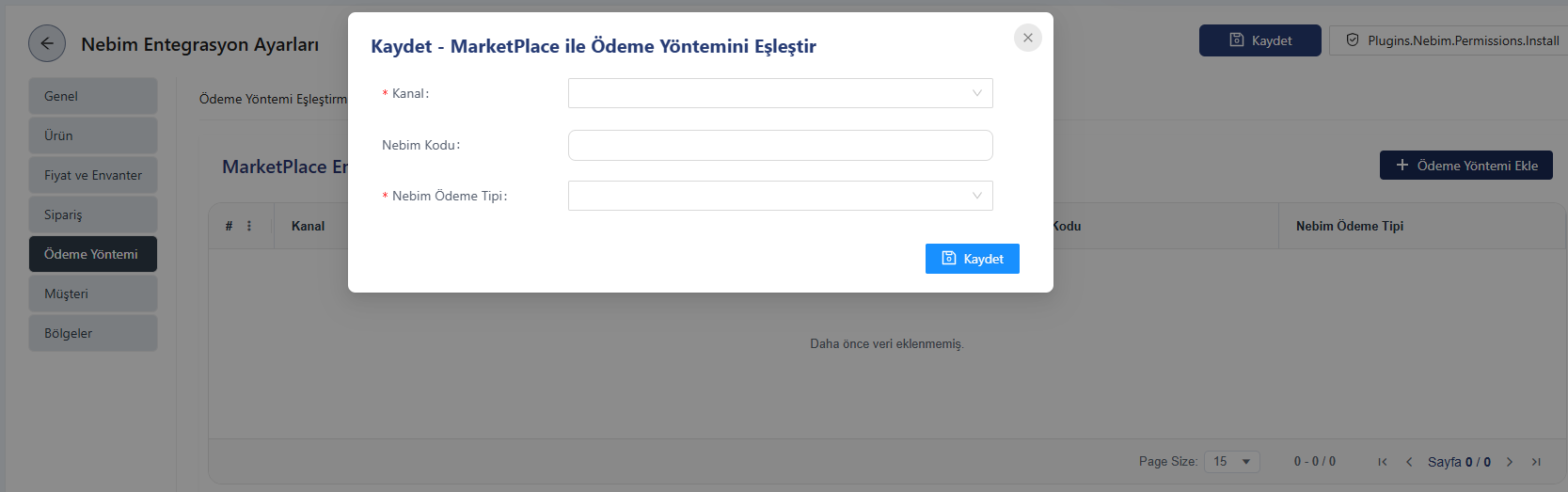 Nebim’e sipariş aktarımının doğru şekilde gerçekleşebilmesi için, müşterinin kullandığı marketplace entegrasyon kanalına ait ödeme yönteminin tanımlanması zorunludur.